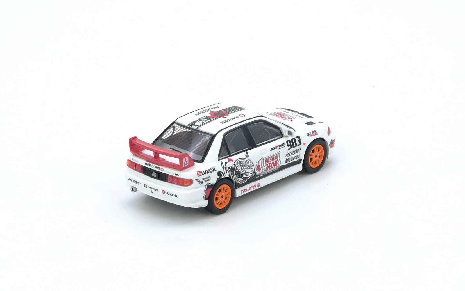 Kultowe Evo III w wyścigowym wydaniu TracKerz Racing. Agresywne malowanie, charakterystyczne felgi i perfekcyjne odwzorowanie detali – obowiązkowy model dla fanów JDM i rajdów.