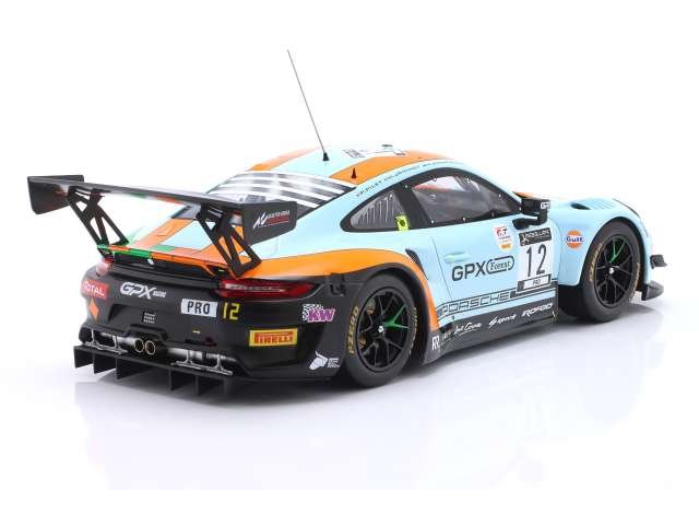Wyścigowa wersja Porsche 911 GT3 R w kultowym malowaniu Gulf, znanym z najbardziej ikonicznych samochodów motorsportu. Charakterystyczne połączenie jasnoniebieskiego koloru z pomarańczowymi akcentami oraz numer startowy #12 nadają modelowi wyjątkowego, kolekcjonerskiego charakteru.