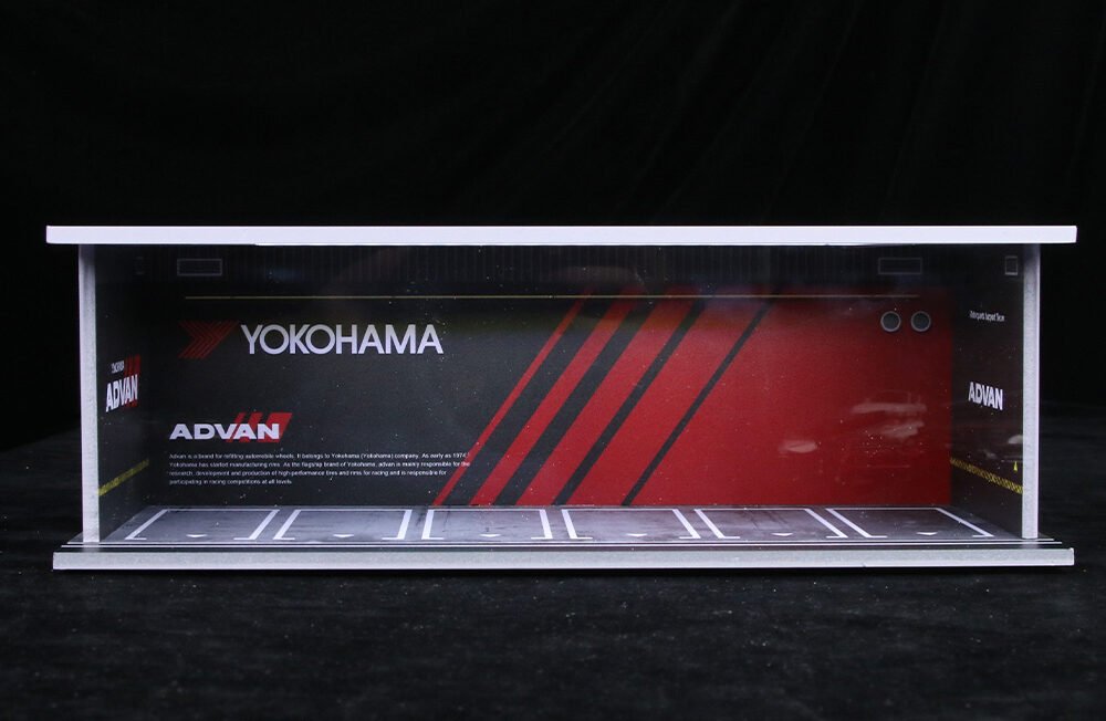 Model przedstawia dioramę parkingową w klimacie marki Yokohama Advan. Projekt utrzymany jest w sportowej, wyścigowej stylistyce z charakterystycznym czerwono-czarnym tłem, logotypami Advan oraz dynamicznymi pasami graficznymi inspirowanymi motorsportem.