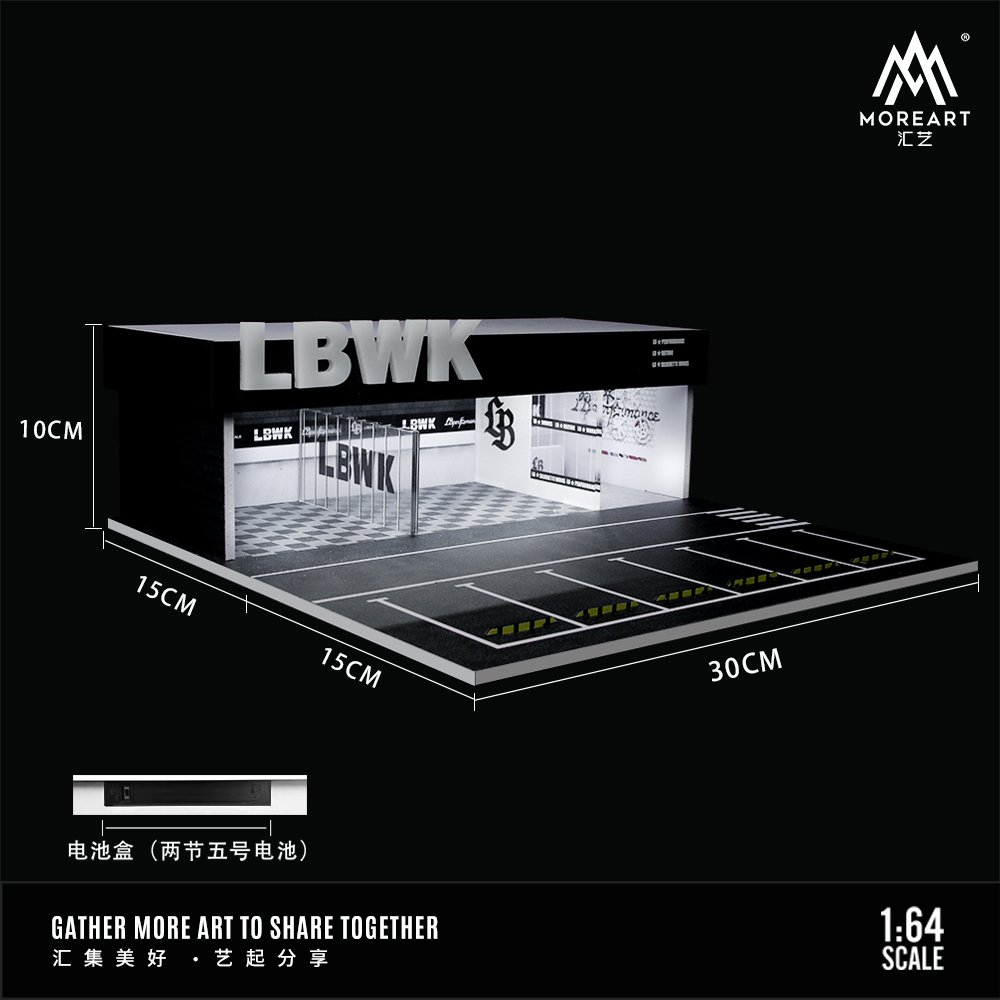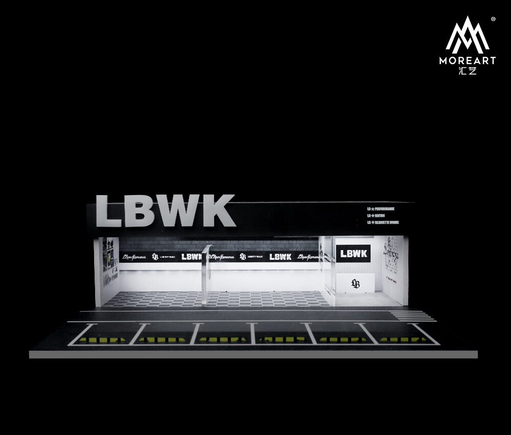 Minimalistyczna diorama Liberty Walk – czarna fasada, logo LBWK i przestrzeń idealna pod ekspozycję JDM, stance i tuner cars. Świetna do zdjęć kolekcjonerskich.