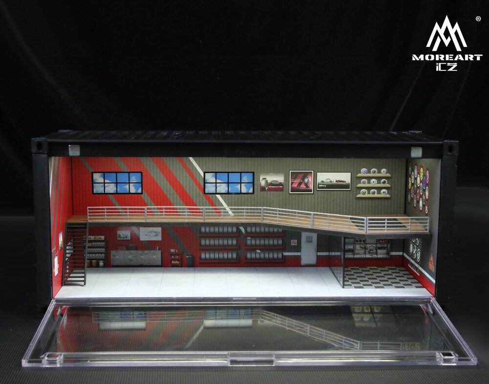 Realistyczna diorama warsztatowa w formie kontenera – świetnie oddaje klimat profesjonalnego serwisu samochodowego. Dwupoziomowe wnętrze z detalami takimi jak regały z kołami, narzędzia, ozdobne panele ścienne i galeria motoryzacyjna tworzą wyjątkowe tło do ekspozycji modeli 1:64.