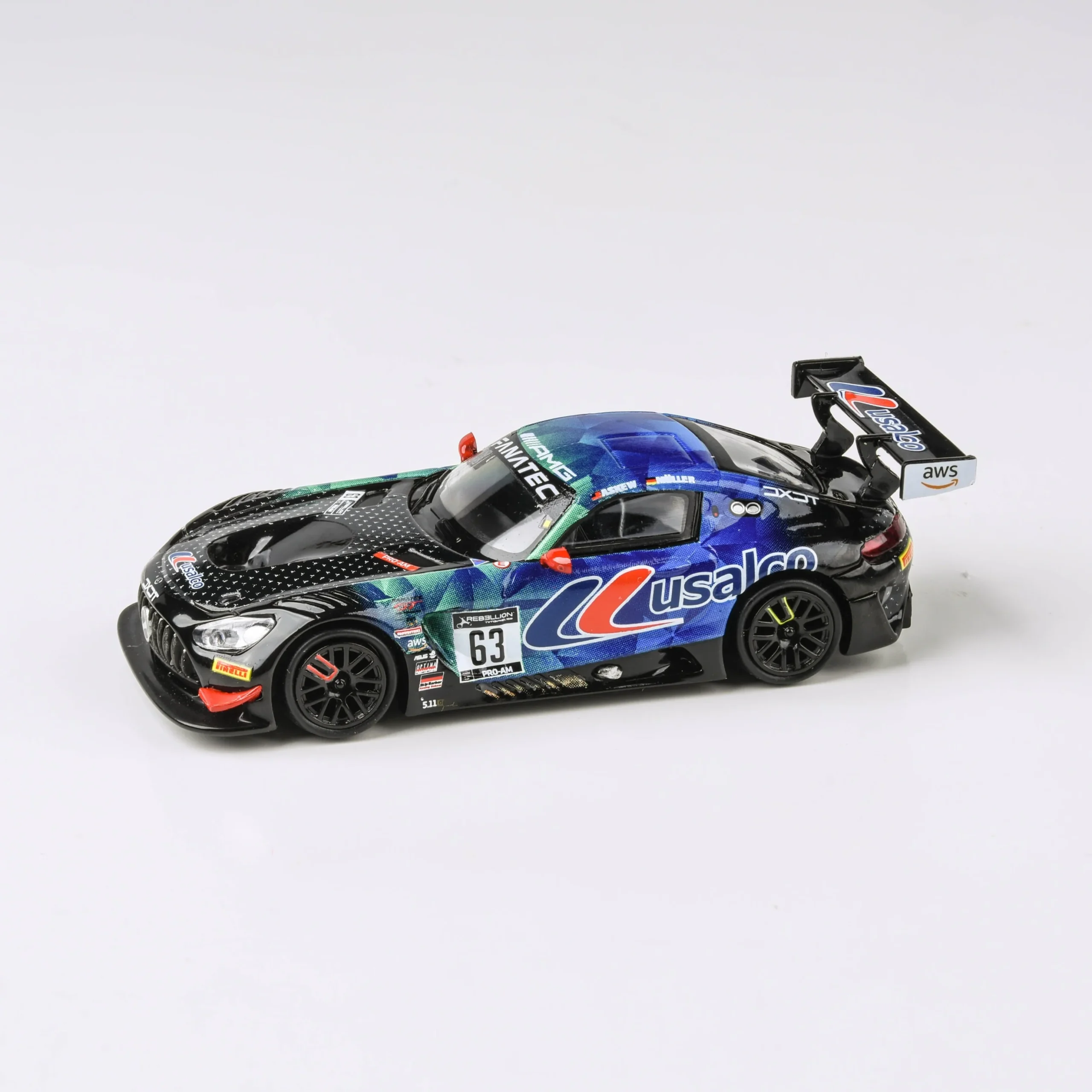 Czarno-niebieska kolorystyka z wyraźnym logo USALCO oraz numerem #63 przyciąga wzrok i świetnie prezentuje się w gablocie. Model idealny dla fanów GT3, AMG, motorsportu oraz kolekcjonerów nowoczesnych aut wyścigowych w skali 1:64.