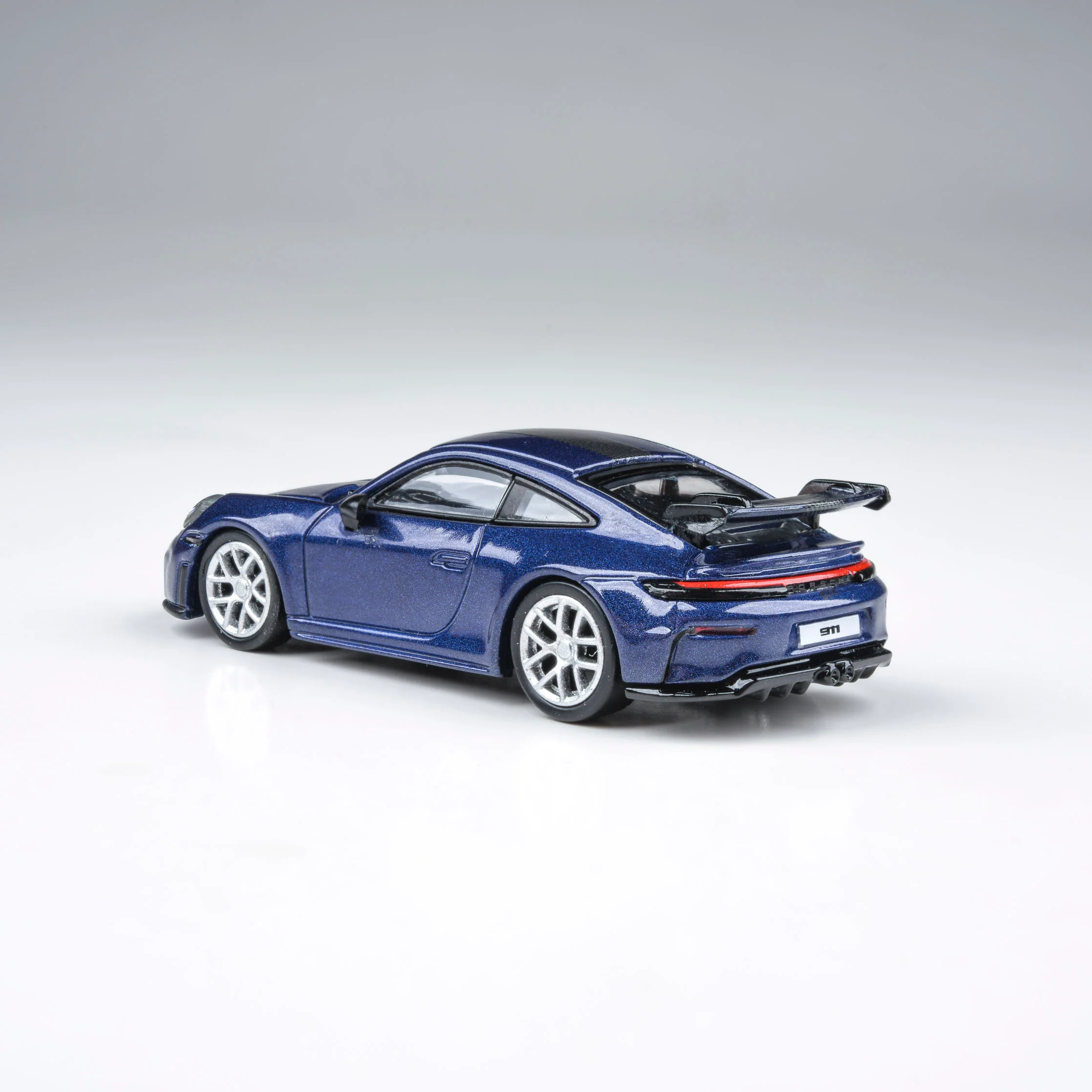 Sportowa Porsche 911 GT3 (992) w eleganckim niebieskim kolorze, odwzorowana w skali 1:64 z dużą dbałością o detale. Charakterystyczne elementy wersji GT3 – agresywny przedni zderzak, centralny pas na masce, poszerzone nadkola oraz masywne tylne skrzydło – doskonale oddają torowy charakter tej odmiany 911.