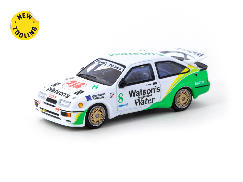 Ford Sierra RS500 Cosworth w barwach Watson’s Water — zwycięzca Macau Guia Race 1989. Klasyczny touring car z legendarnym silnikiem Cosworth, perfekcyjnie odwzorowany przez Tarmac Works.