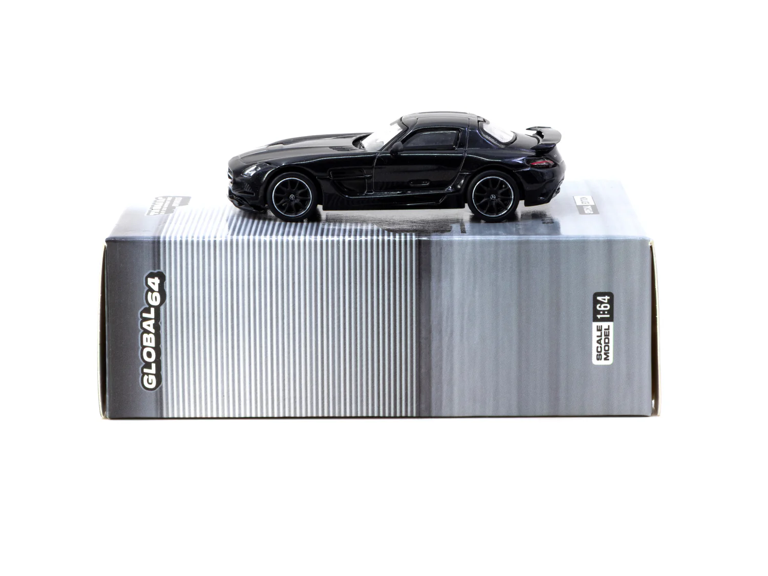 Klasyczny Mercedes-Benz SLS AMG w eleganckiej, czarnej wersji od Tarmac Works z serii Global64. Model przedstawia jedno z najbardziej charakterystycznych aut sportowych Mercedesa – z długą maską i kompaktową tylną częścią.
