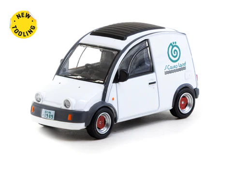 Kolekcjonerski model Nissan S-Cargo od Tarmac Works w skali 1:64 – jeden z najbardziej charakterystycznych japońskich kei-vanów lat 90. Model wyróżnia się kultową, zaokrągloną sylwetką oraz unikalnym malowaniem J.Cargo Land, inspirowanym miejskim klimatem Japonii.